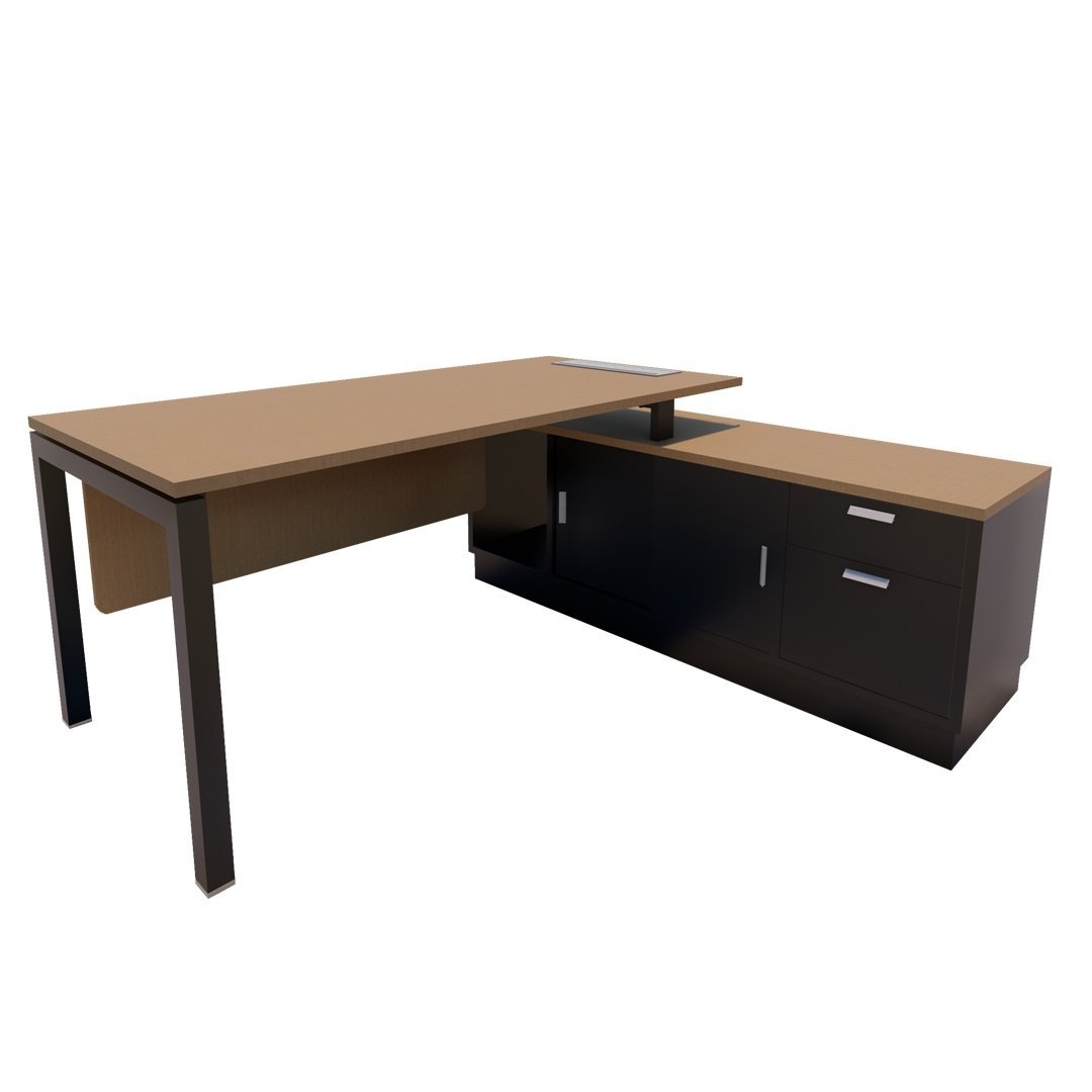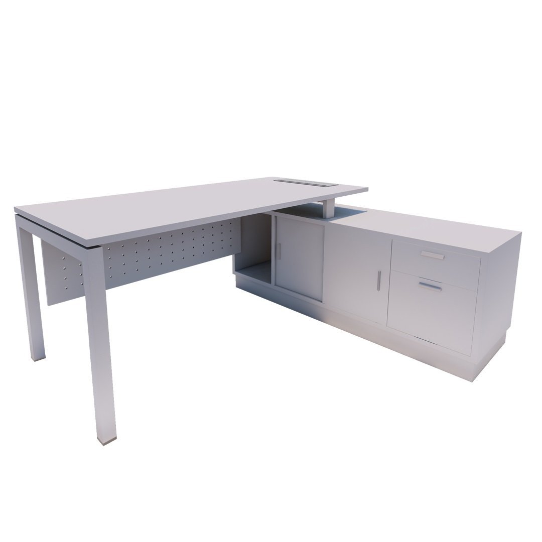 Director table comes with N shape leg base, wooden modesty panel and 1 unit 4 gang flipper box. Side cabinet comes with open shelf, sliding door and 2 drawer.
