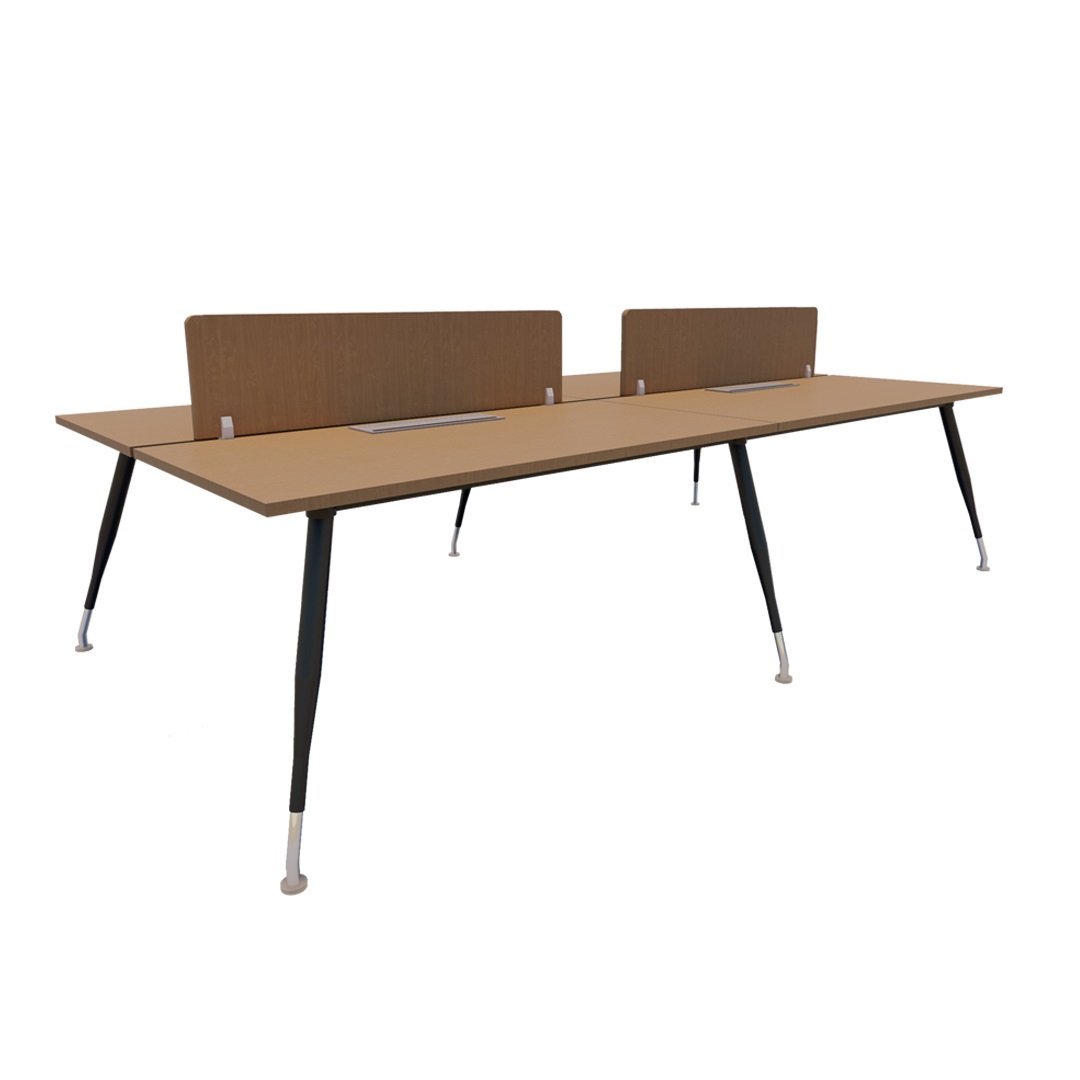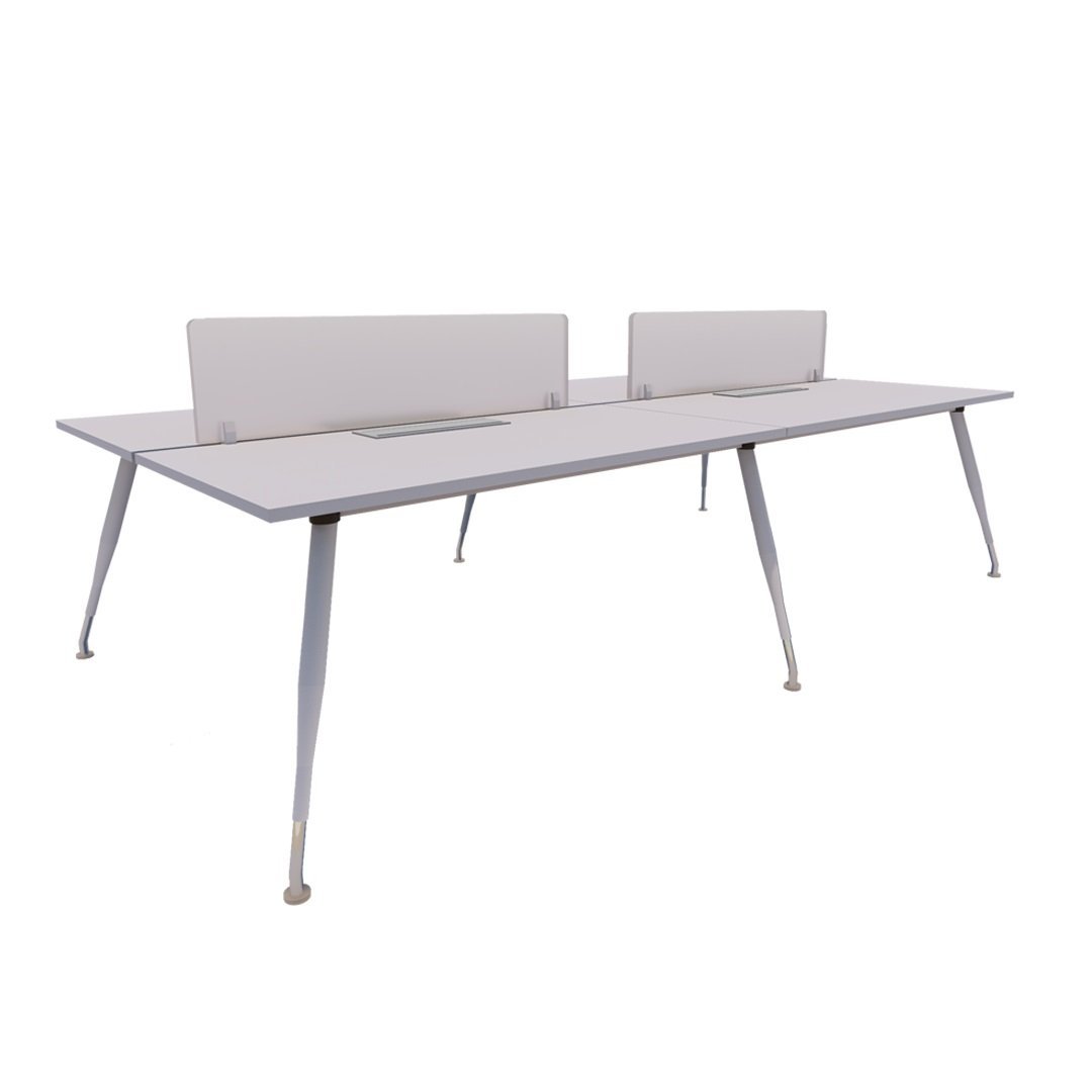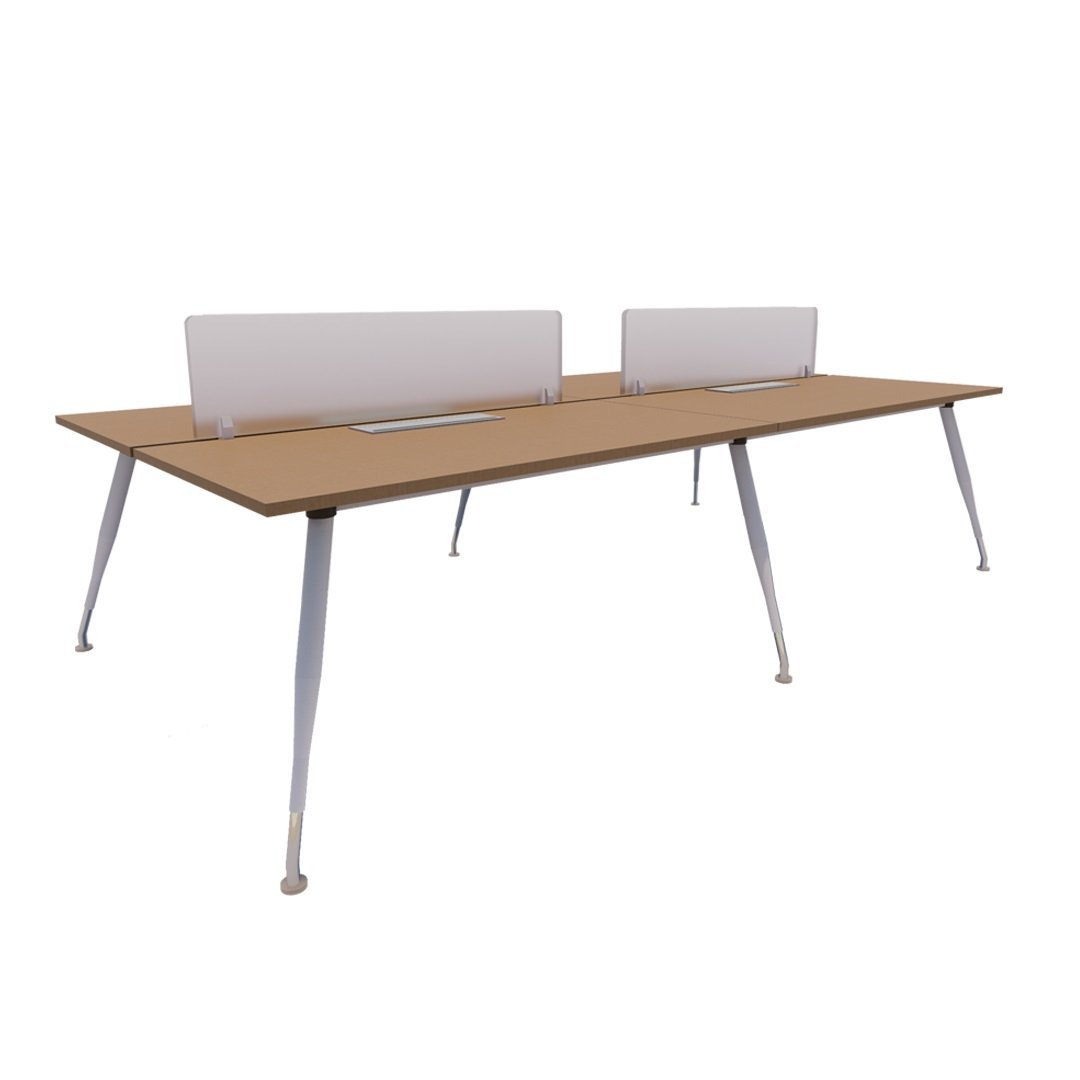 Cluster of 4 workstation come with classy spyder leg base, hanging glass partition, and 4 unit 4 gang flipper box. It provides flexible and collaborative workstations in the workplace.