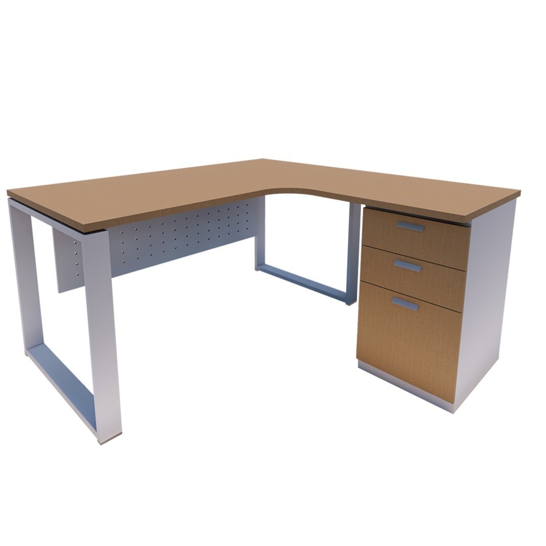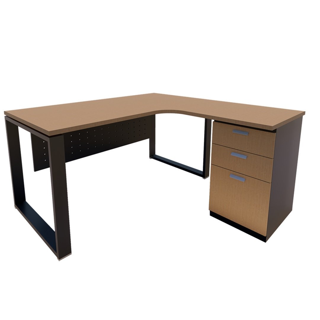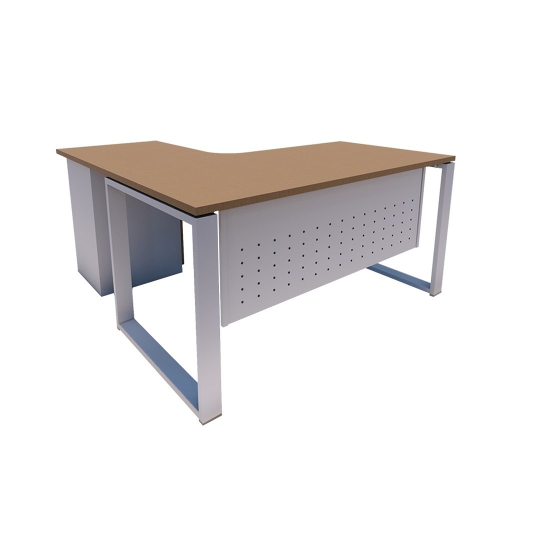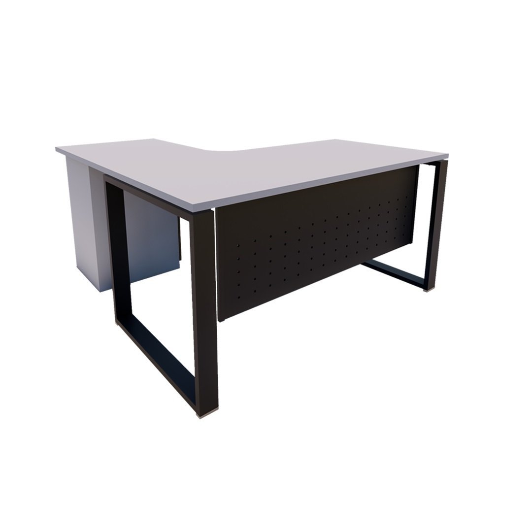 L-shape table comes with square shape leg base and fixed pedestal. Mostly used by senior professionals, a large executive desk.