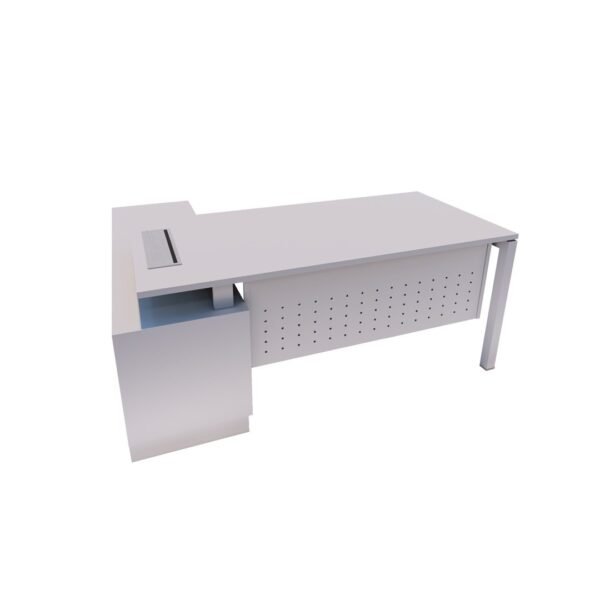 Director table comes with N shape leg base, wooden modesty panel and 1 unit 4 gang flipper box. Side cabinet comes with open shelf, sliding door and 2 drawer.